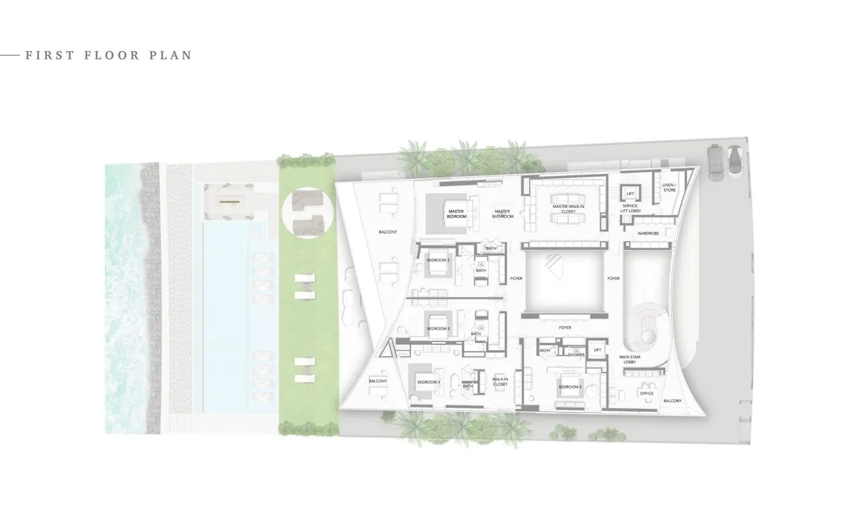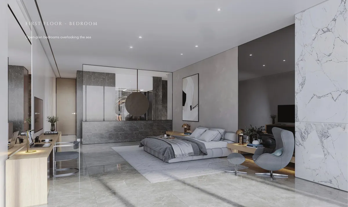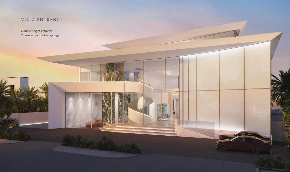 Modern life by the sea, inspired by the colors of seashells and soft shapes, harmonizes with smooth white spaces and palm trees. The design of this beautiful villa is inspired by refined taste and a high-quality lifestyle. The interiors are distinguished by luxury, but at the same time by warmth and hospitality. Each room is elegant and thought out to the smallest detail, which is a clear reflection of the unique and refined luxury residence. This architecturally irresistible villain combines fashion, art and trends. The minimalistic light but textured base palette is used in accordance with the architectural design and highlights the double height spaces and stunning volumes throughout the villa. This basic aesthetic is complemented by the textures and colors of the decorative finishes, high-quality fittings and decorative elements, which are considered a harmonizing and enriching palette in relation to the basic materials used everywhere. The villa consists of 7 bedrooms with bathrooms, 1 chef’s room and 4 staff rooms.