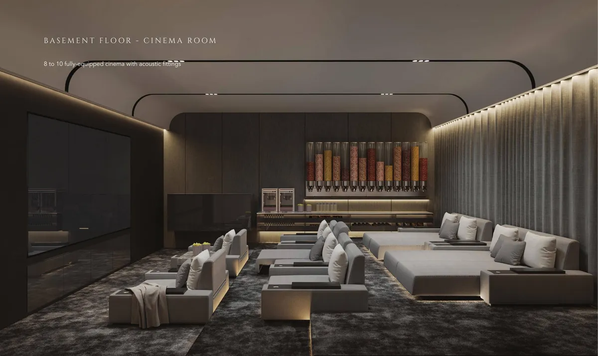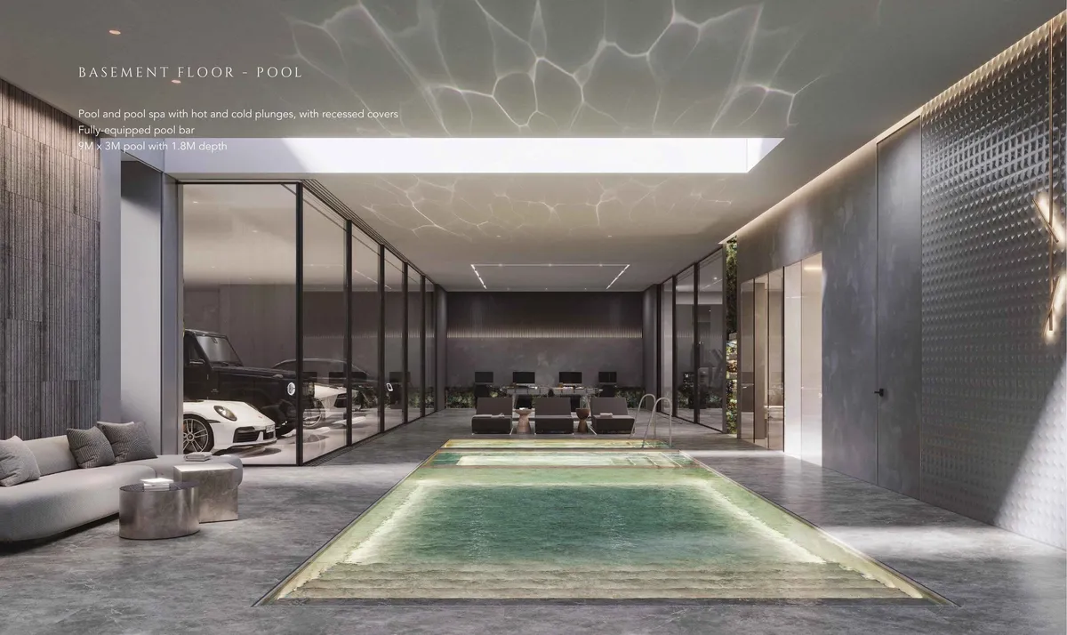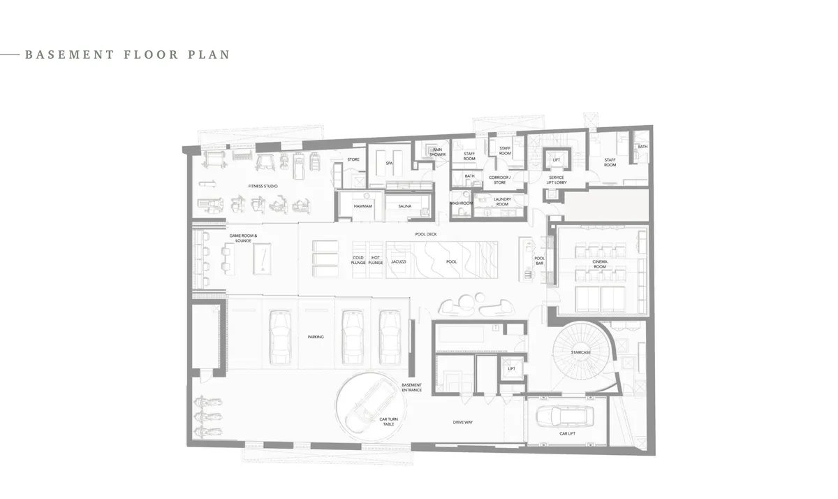 Basement Floor includes: car lift with underground showroom, car turn table to display the car with a light effect on top. Fully-equipped cinema room with acoustic materials. Fully equipped Fitness Studio by European manufacturer. Spa area with Massage Room, Steam, Sauna Room and Rain Shower. Pool with separate Jacuzzi, hot and cold plunge pools with recessed covers. Automated sliding glass panels to separate the pool and game area from the parking and gym. Back of house area with 3 ensuite staff bedrooms and laundry room.