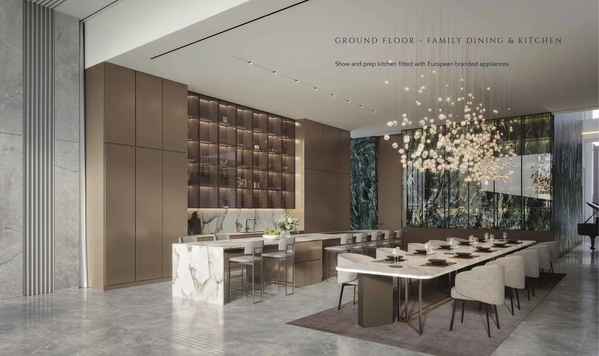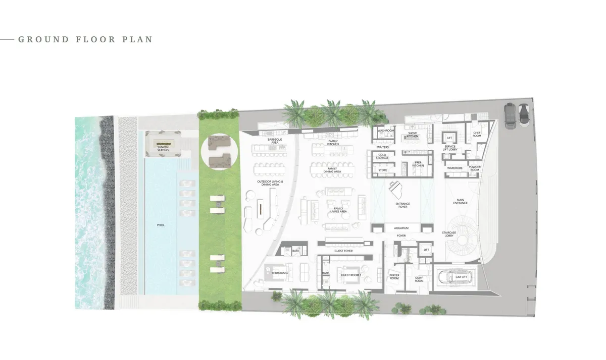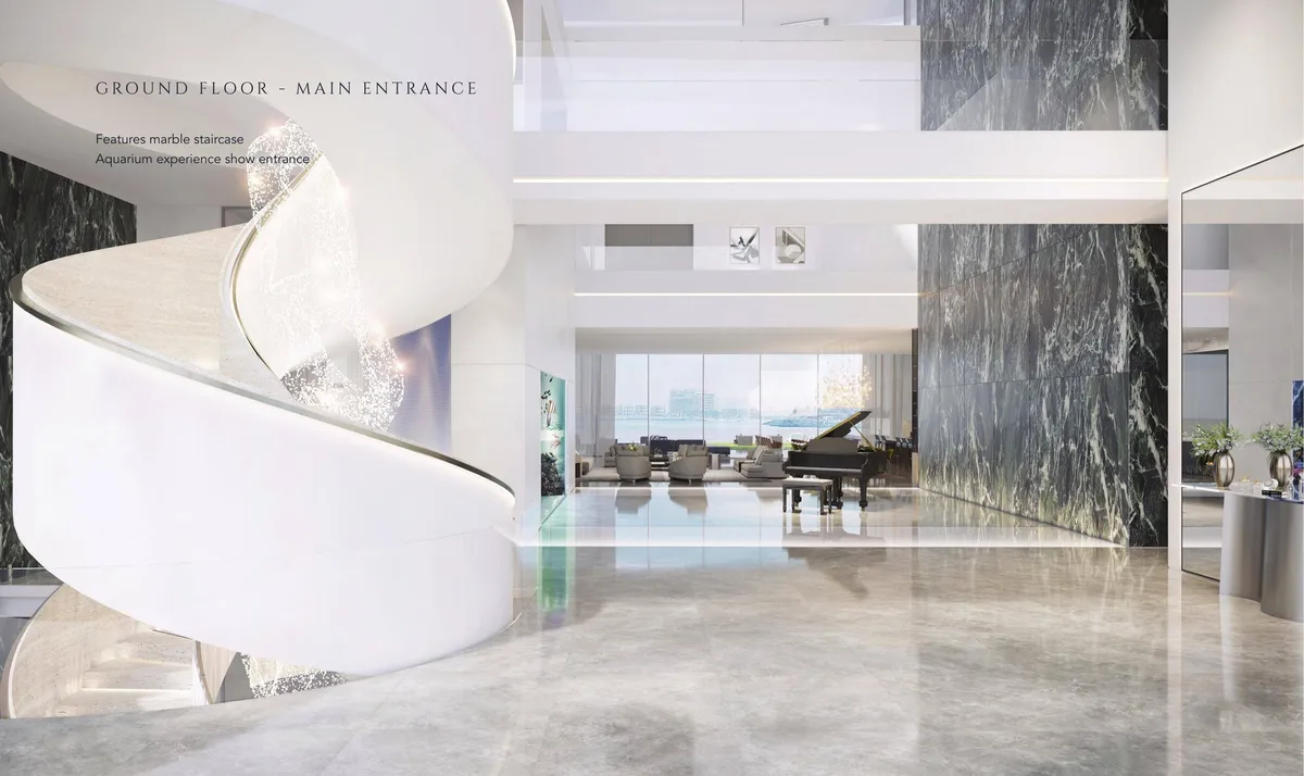 Ground Floor includes: Features spiral staircase cladded with marble, fully functional aquarium entrance area, partial glass flooring that shows the Basement level from the Ground floor. Prep kitchen with preparation area, store, cold store and staff area. Prayer room with ablution. 5m x 19m infinity-edge pool with 8 built-in sub loungers. Electric built-in fireplace integrated into the living room wall. Pool deck with sun loungers and sunken seating, outdoor lounge area with built-in fireplace and pop-up TV, fully-equipped barbeque area. Outdoor home automated audio and speaker system, outdoor security system. In-floor TV lift