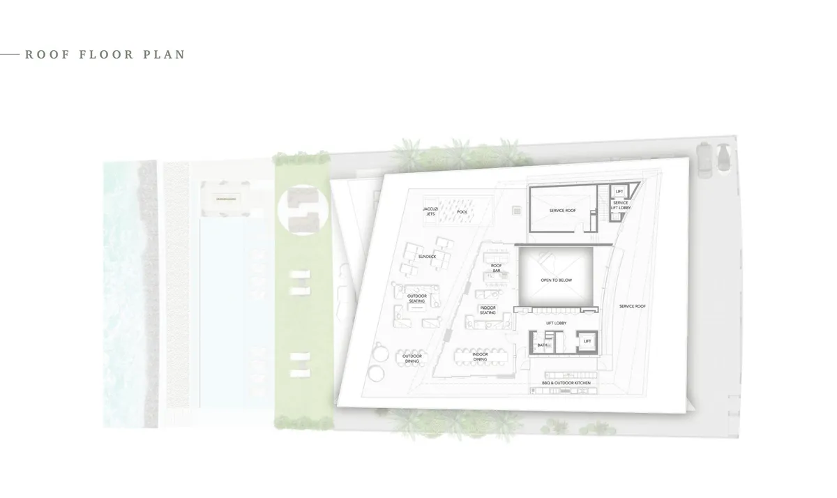 Roof Floor includes: Outdoor pool with Jacuzzi and glass bottom. outdoor shower area and indoor bathroom. Indoor/outdoor seating and dining area and bar with automated sliding glass. Seating area with a built-in electrical fireplace. Fully-equipped barbeque area and outdoor kitchen