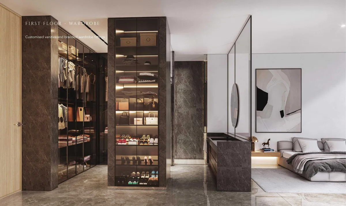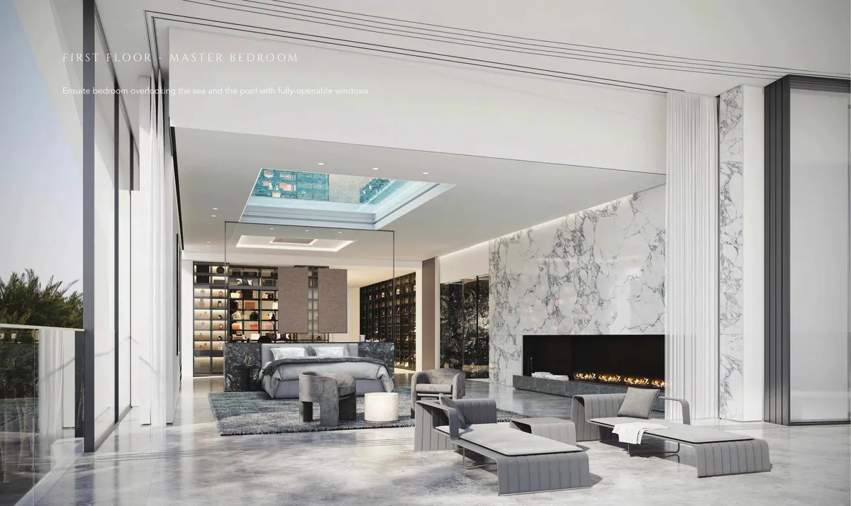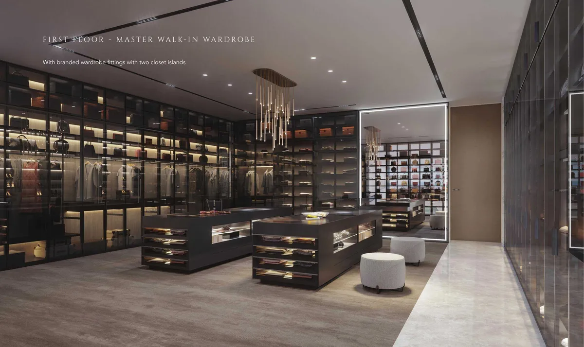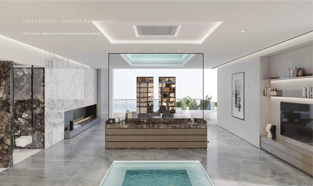 First Floor includes: Open-plan master ensuite bedrooms. Master bathroom with Jacuzzi, electric built-in fireplace and glass ceiling. Office with high-end fitted wall unit. Bedrooms with custom-made vanities, branded walk-in closets. Built-in kitchenette
